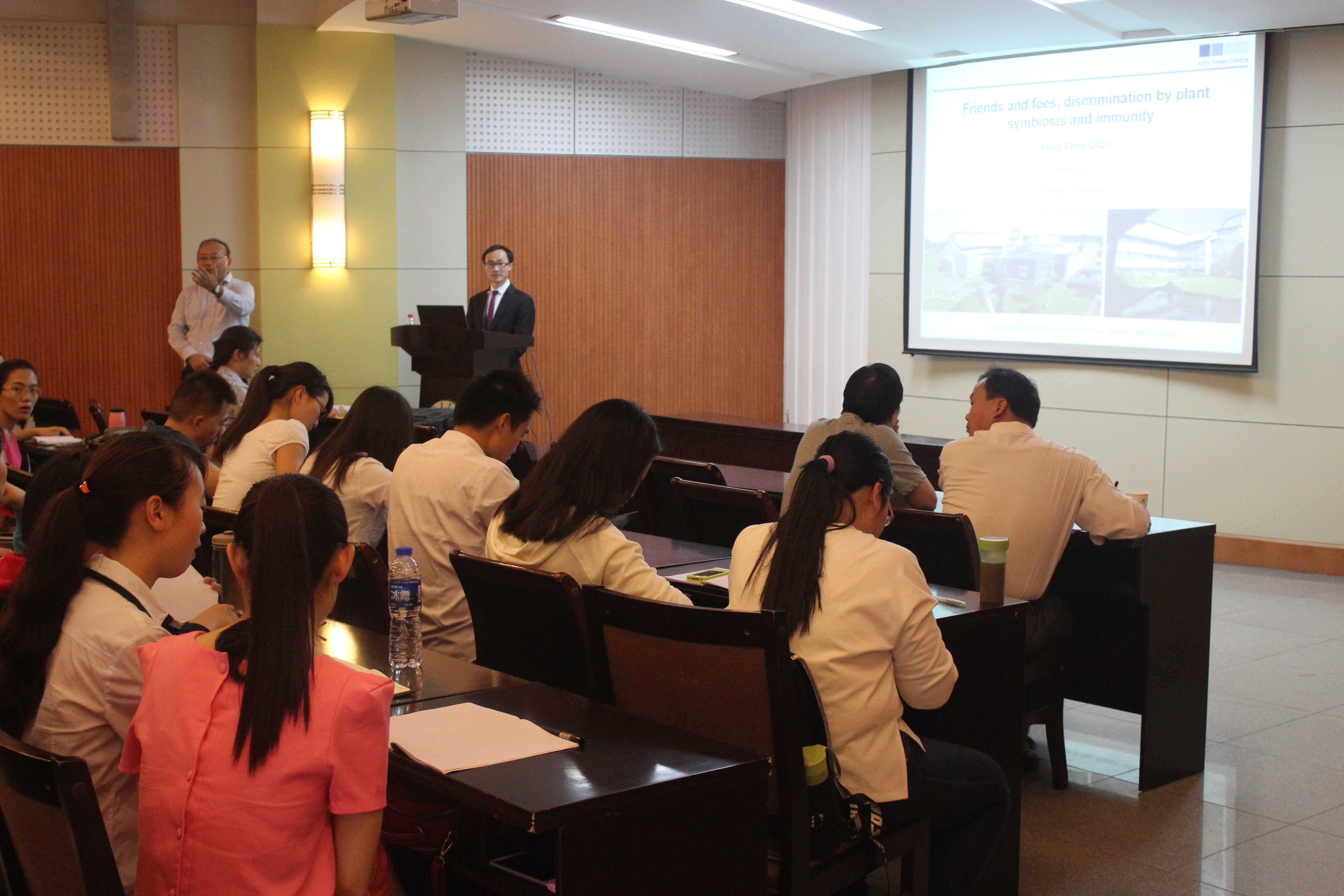 邀请,在我校文化路校区校礼堂100人报告厅,冯峰博士做了题为《Friends and foes,discrimination by plant symbiosis and immunity》的学术报告,参加报告会的有生命科学、农学院、植物保护等学院的广大师生。冯锋博士长期从事植物和病原微生物以及共生真菌互作的研究,试图阐明植物天然免疫和共生信号转导的分子机理,主要研究成果以第一作者在Nature、Cell host & microbe, Current opinion in plant biology等期刊发表,主持国家自然科学基金面上项目一项,并于2012年获得吴瑞奖学金。报告会上,冯博士结合自己的科研项目,详细讲述了影响植物共生和免疫物质作用的机理等相关知识,并热情与师生探讨学术报告的相关问题,激发了老师和研究生的科研热情。