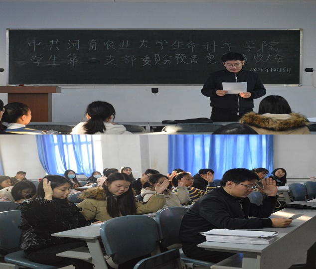 本次会议秉承着“公正、公平、公开”的态度,严格按照党组织接受预备党员程序执行。首先,会议第一阶段各支部党员发展对象逐一宣读《入党志愿书》,陈述入党动机及个人表现,向党组织表明了加入中国共产党的强烈愿望。接着由各发展对象入党介绍人向参会者介绍发展对象政治思想、学习、工作等情况,分别结合各位发展对象的表现和对其考察的情况,表达了自己的意见。随后大会进行讨论表决,认为本次发展对象基本符合党员条件,经与会正式党员采取举手投票方式对发展对象进行逐一表决后,一致决定同意接收本次所有发展对象成为中共预备党员。在党支部书记宣布大会决议后,预备党员们纷纷表示会牢记使命,坚定不移跟党走,严格要求自身,争取早日正式加入中国共产党。会议的第二阶段,各党支部书记对大会进行总结发言并为新预备党员上了一堂生动的党课。各党支部书记们结合优秀党员的英勇事迹,强调新时代大学生党员要牢记初心使命,认真履行党员义务,并对新预备党员提出了要求和期望,希望新预备党员在日常生活、学习中严格要求自己,向优秀共产党员看齐,同时也对毕业班党员毕业前思想、行为提出规范要求,希望他们在大学最后的时间内能够起到党员应有的模范带头作用,做一个敢于担当、一身正气的新时代青年。
