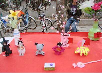 周日在8号楼前,我们举办了大型的手工艺品展览活动,各班女生都踊跃参加,作品以文明、安全为题材,展示了一系列包括绘画、摄影、书法、拼图、剪纸、折纸、十字秀、针织、制作布娃娃等体现大学生的爱好及创作潜力的特色作品。