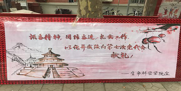 考研、考博情况。同时,宣传部也制作两个条幅并悬挂在老区八号 楼门口来迎接18级新生。