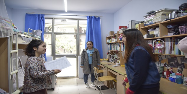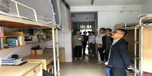寝室是学生在校的第二个家,也是安全形势最为严峻,卫生情况最令人担忧的地方。此次走访学生宿舍,张晶老师全面检查了女生寝室,强调了寝室应当注意的安全问题和干净整洁的寝室对于学习和生活的重要性,并关心学生们最近的身体状况和学习情况。冯超老师关心今年刚刚搬到桃李园学生公寓的2018级学生,了解学生们是否适应桃李园的住宿条件和周边环境,提醒学生们要注意自己的人身安全和寝室安全。在走访过程中,除了查看学生宿舍卫生和是否有大功率电器,还查看了宿舍值日表、党员名帖的张贴情况,团委老师希望学生牢记宿舍“923”公约,打造良好的宿舍卫生、安全、学习环境。