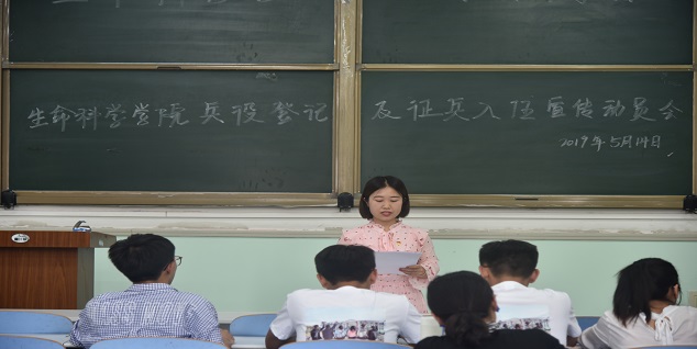 会上,张晶宣读了《关于做好2019年兵役登记及征兵入伍工作的通知》,从兵役登记、征兵对象和范围、应征入伍条件、报名时间和应征程序、大学生应征入伍优惠政策等方面,详细介绍了大学生兵役登记和征兵入伍的流程和相关政策,并要求学生干部要高度重视,广泛宣传,切实落实学院要求,在班级内部开展兵役入伍动员班会,鼓励号召广大适龄学生强化使命意识和责任担当,把握新时代机遇,积极参加兵役登记,踊跃报名参军。之后,团委书记雷雯再一次阐述了大学生应征入伍优惠政策,并结合学院学生实例对大学生应征入伍本地额外奖励优惠政策进行了补充说明,并对有些同学提出的兵役登记疑惑进行了解答。雷雯最后期望广大适龄学生能够积极参军入伍,勇担使命,报效国家。