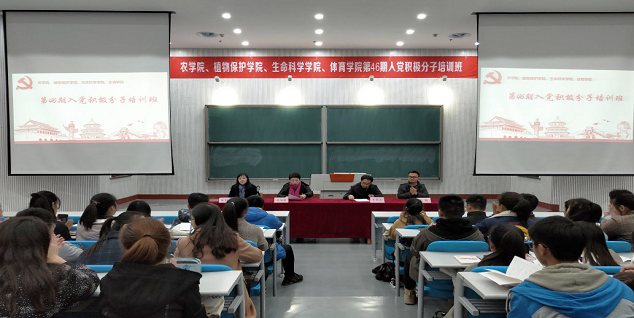 开班典礼在庄严的国际歌中拉开帷幕。王宏立宣读了《农学院、植保学院、生命学院、体育学院第46期入党积极分子党的基本知识培训班计划》,吴旭静对本次培训班的内容及安排进行了简单的介绍,并对参加培训的全体学员提出了希望与要求。在为期两天的集中培训中,授课老师分别围绕《传达学习党的十九大精神》、《中国共产党的最高理想和现阶段的奋斗目标》、《中国共产党的性质和宗旨》、《中国共产党的指导思想》、《中国共产党的组织原则、纪律和作风》、《中国共产党党员的条件和发展程序》六大专题进行了详细解读。