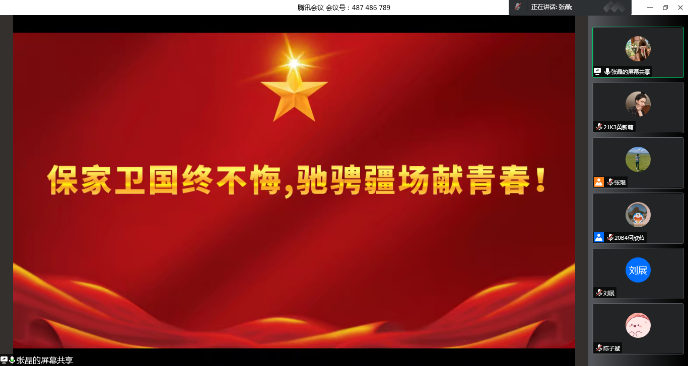 组织召开团委例会暨2023年征兵入伍动员大会。此次会议采用线上的方式进行,团委老师张琨主持,团委书记刘展、团委副书记张晶、各年级辅导员出席,各年级各班班长支书参加。