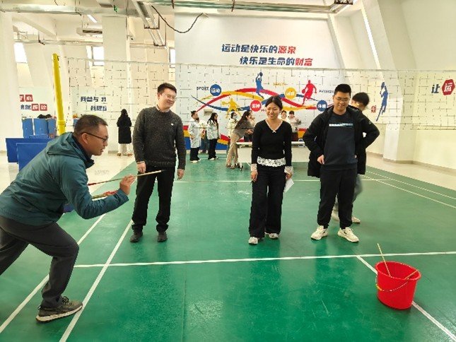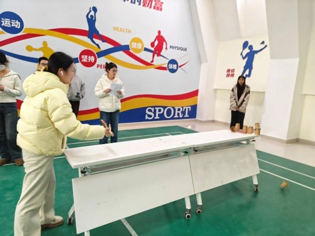趣味项目区同样人气十足。“穿越风暴”运输赛中,选手们4人一组,需在保持乒乓球不掉落的前提下快速完成接力,考验着团队间的默契配合与临场应变能力;乒乓球版保龄球创意十足,选手们用乒乓球替代保龄球撞击纸杯阵,看似简单的规则却充满挑战,精准瞄准、轻轻发力,随着纸杯的应声倒地,现场欢呼声不断;投壶挑战则兼具传统韵味与趣味体验,选手们站定、瞄准、投掷,一次次尝试中既有失误后的调侃,也有命中后的雀跃,轻松愉快的氛围感染着在场每一个人。趣味项目以低门槛、高互动的形式,让更多同学走出观众席、投身赛场,在挥洒汗水的过程中释放压力、收获快乐,在协作互动中拉近彼此距离、增进同窗情谊。