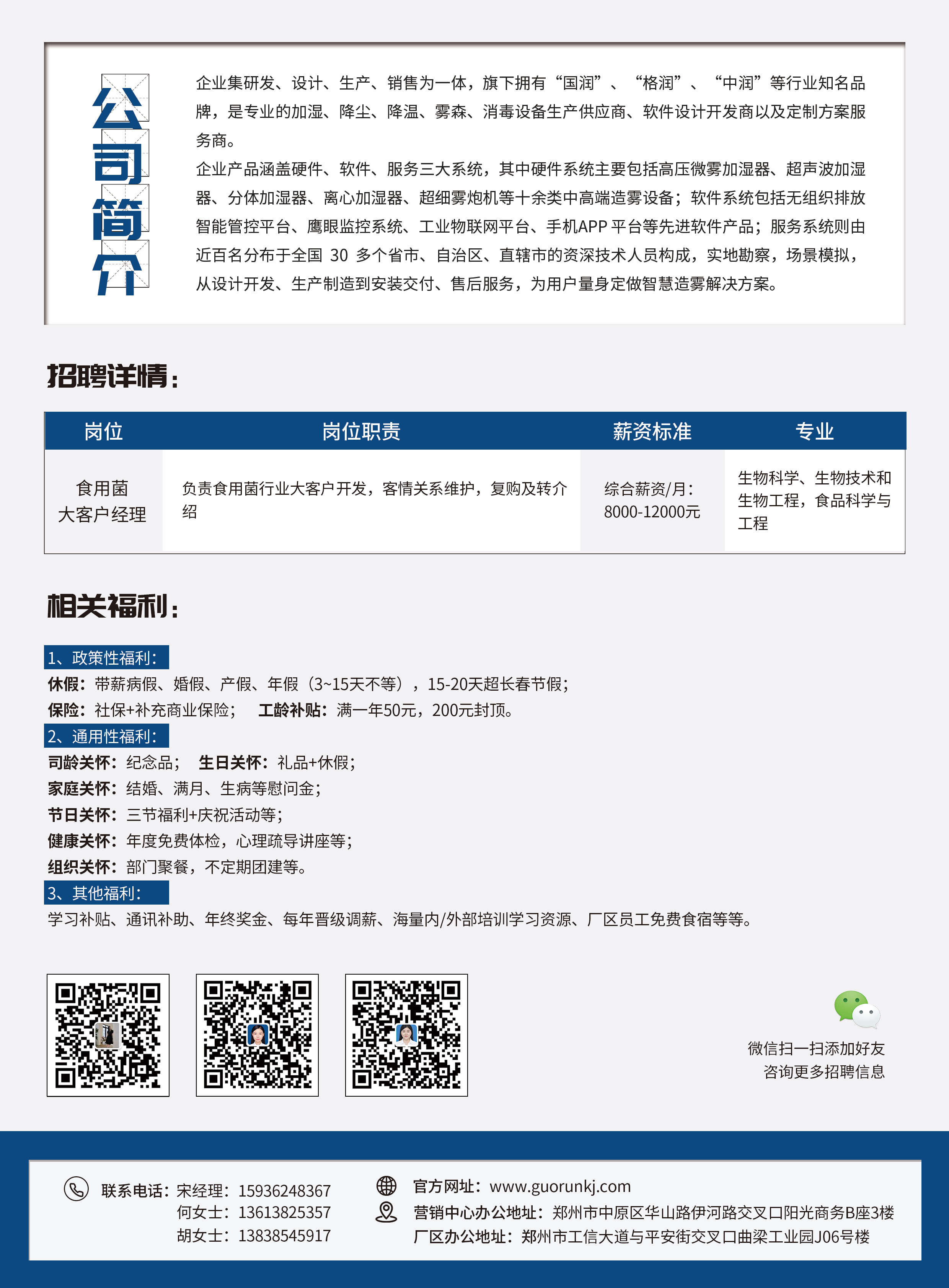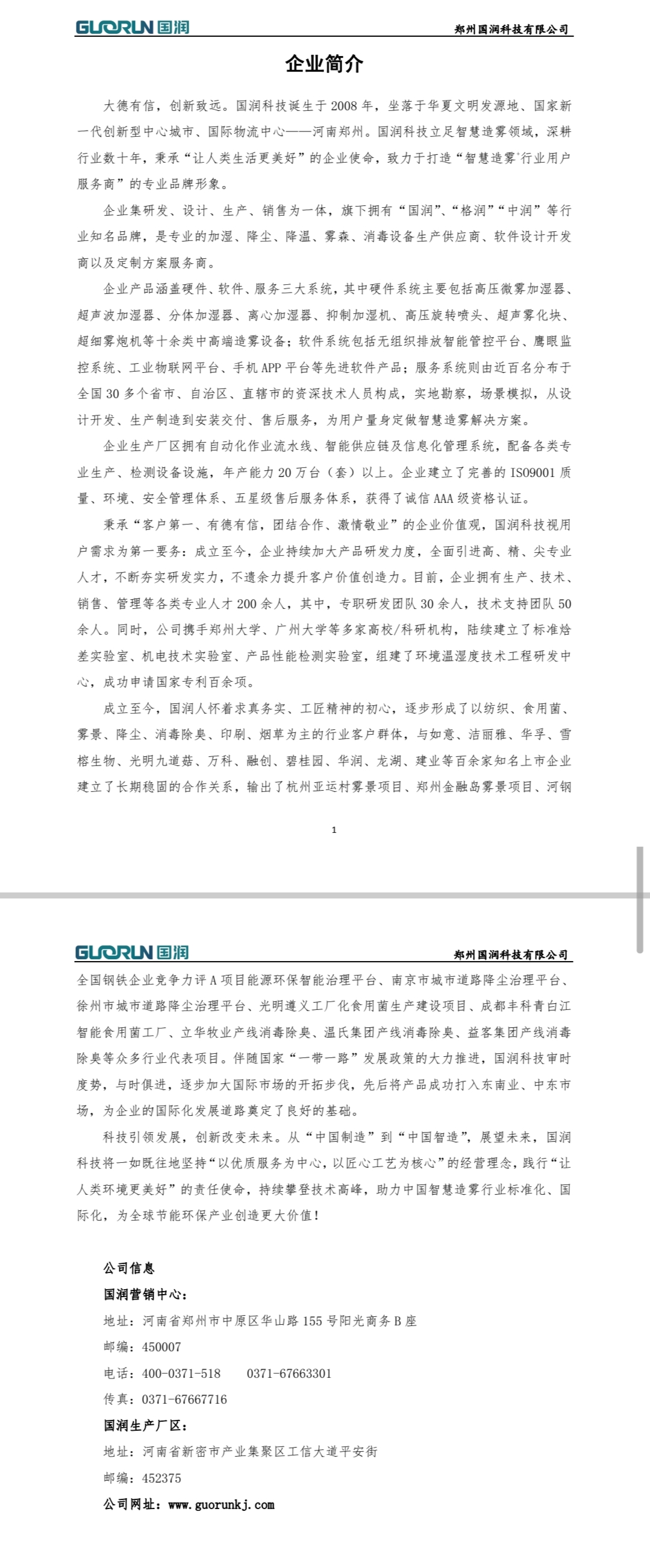 郑州国润科技有限公司,是国内食用菌工厂加湿、降温、除湿、除尘、雾森设备和配件生产企业。