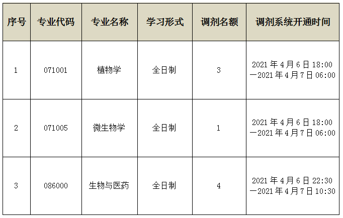 根据目前招录情况,色情片 植物学、微生物学、生物与医药专业调剂系统开通安排如下,请符合条件的考生积极报名。