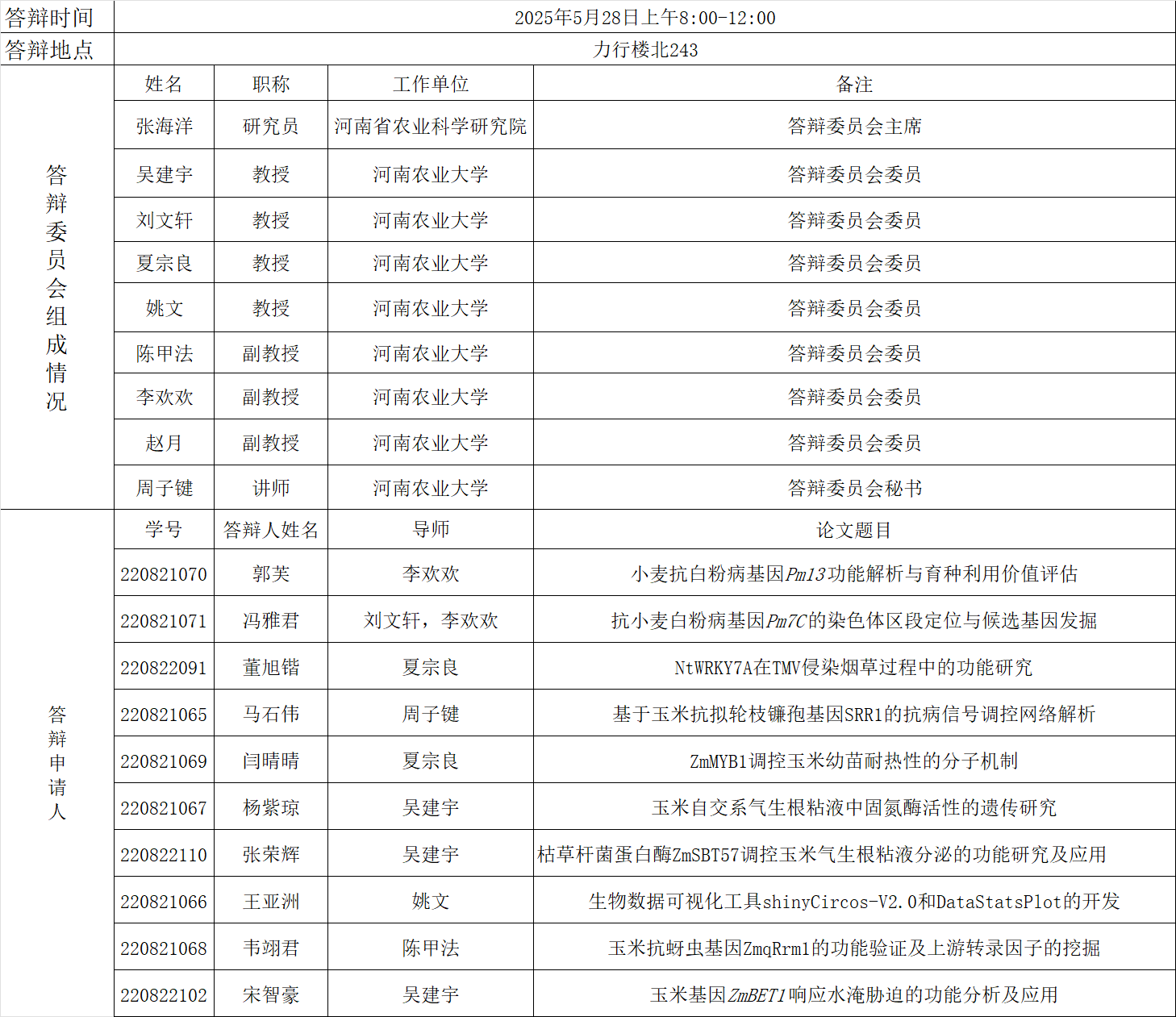 2025年上半年遗传学硕士研究生毕业答辩公告