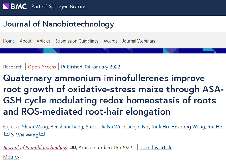 资源植物种质与分子生理、功能基因组学团队与植保学院纳米农药团队合作在解析纳米材料促进玉米生长机制研究方面取得重要进展。该研究以“Quaternary ammonium iminofullerenes improve root growth of oxidative-stress maize through ASA-GSH cycle modulating redox homeostasis of roots and ROS-mediated root-hair elongation”为题在线发表于国际知名期刊Journal of Nanobiotechnology。