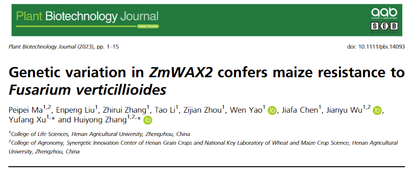 张会勇团队致力于玉米拟轮枝镰孢菌抗性基因的挖掘和功能研究(Zhou et al., 2020, Genomics Proteomics & Bioinformatics;Xu et al., 2022, Molecular Plant Pathology;Ma et al., 2022, Plant Disease),本研究通过ZmWAX2的功能解析为玉米拟轮枝镰孢菌病害广谱抗性改良提供了一个重要的基因资源。张会勇团队博士生马培培为该论文第一作者,张会勇教授和青年教师徐玉芳为通讯作者。该研究得到了国家自然科学基金和河南农业大学高层次人才基金的资助。