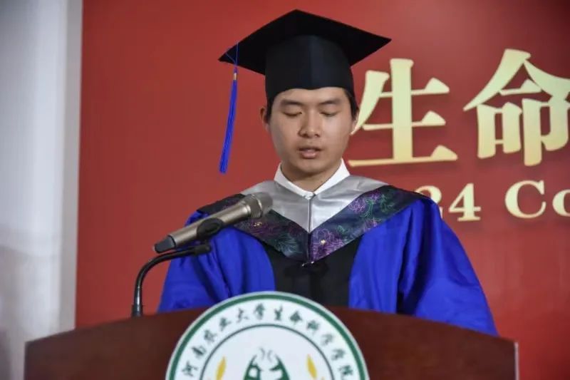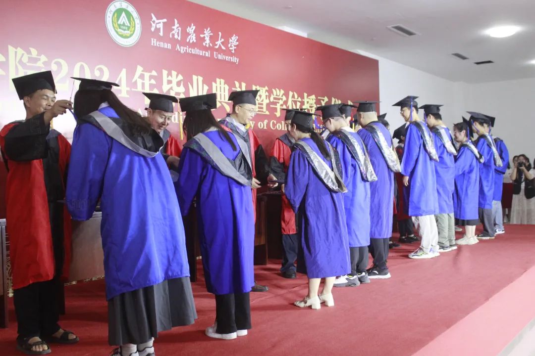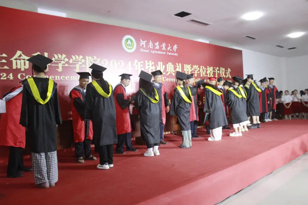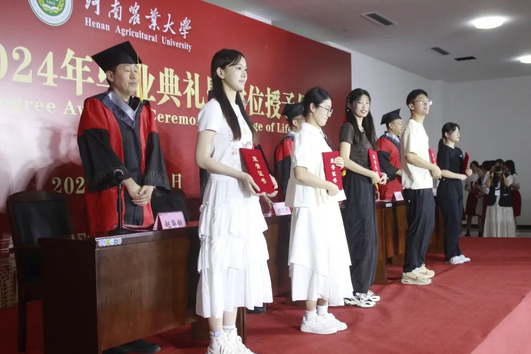 校级、院级优秀毕业生表彰名单;郑文明宣读河南农业大学博士硕士学位授予决定;张会勇宣读河南农业大学学士学位授予决定;学院领导老师为2024年优秀毕业生代表颁发证书。