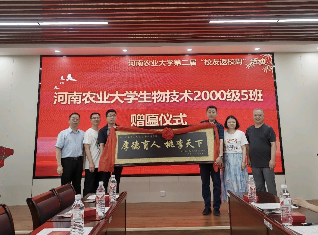 生物技术2000级5班校友向学院捐赠了“厚德育人 桃李天下”的牌匾,祝愿学院蓬勃发展,人才辈出,为国家粮食安全、中原粮仓提供更加坚实的保障。