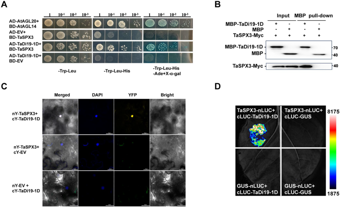 为阐明TaSPX3调控小麦抗病的分子机制,本研究以TaSPX3蛋白为诱饵,通过酵母双杂交筛选小麦cDNA文库,鉴定出锌指转录因子TaDi19-1D为TaSPX3的候选靶标。作者进一步利用体外pull-down、双分子荧光互补和分裂荧光素酶互补实验,证实TaSPX3与TaDi19-1D能够在体内外互作(图2)。