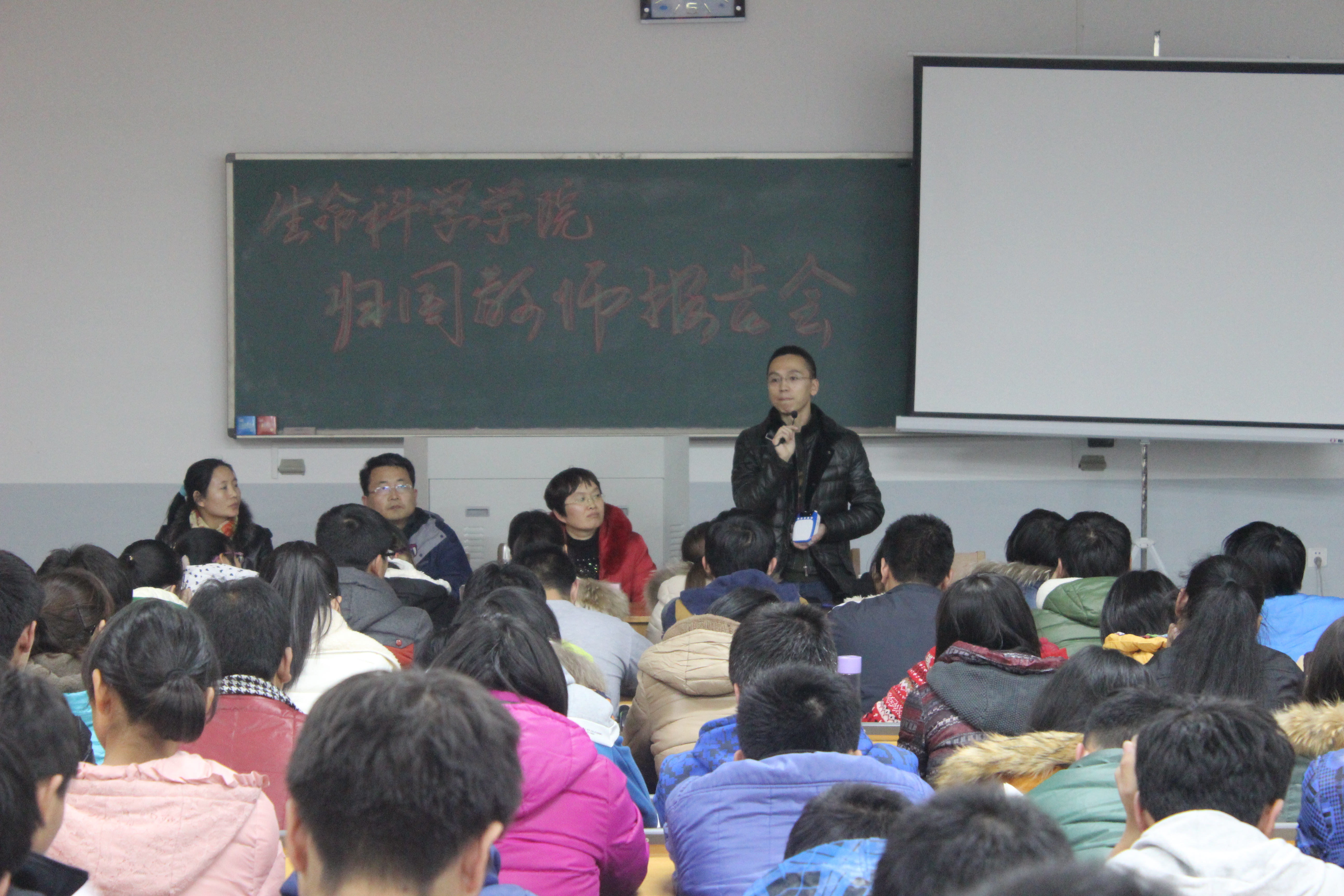 理学博士梁振普在加拿大留学两年,海外学术研究及生活经历,是同学们关注的焦点,也自然成为本次报告会的主题。首先,梁振普讲述了他在加拿大期间的主要研究方向及承担的研究课题,包括对相关课题、研究的介绍以及研究成果产生的巨大科学价值和社会意义。接着,梁振普向同学们讲述在加拿大丰富多彩的生活,梁老师精彩的讲述,让加拿大的地域风情、美丽风光深刻地印在同学们的脑海中,一双双眼睛带着羡慕与憧憬,都是对理想的渴望,对未来的向往。最后,14级生物工程专业的班主任依次上台发言,鼓励同学们努力学习,一再强调学好英语及专业知识对将来考研或者出国的重要性,告诫大家珍惜美好时光,早作准备,争取继续深造的机会。报告会持续了两个多小时,最后在同学们热烈的掌声中圆满结束。