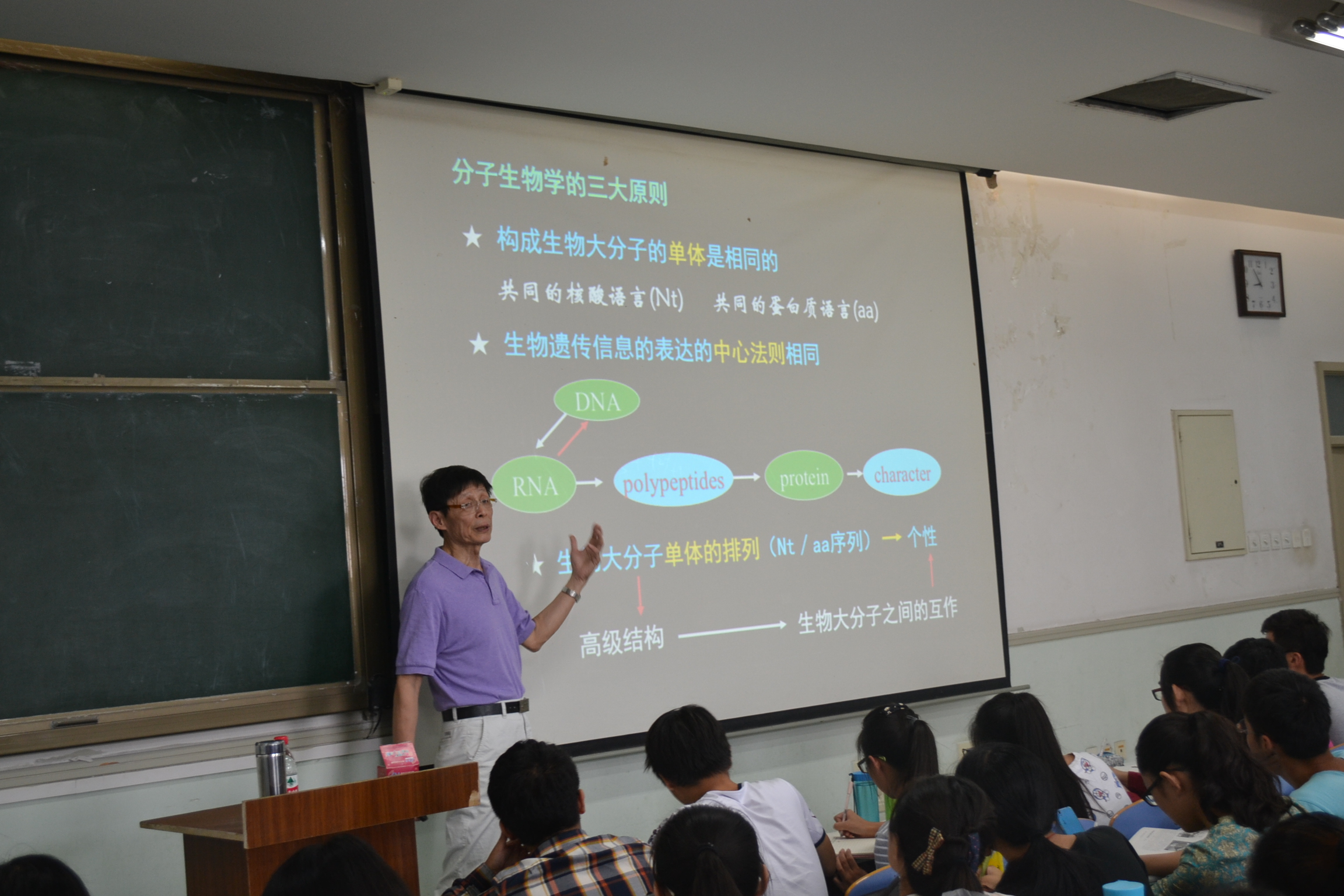 与农学院联合,专门聘请国家级教学名师华中农业大学郑用琏教授,来我校为绍骙实验班讲授的《分子生物学》在工程楼302正式开课。郑教授满怀激情,充满师爱的课堂感染了每一位同学,学生们不仅学到了相关知识,也从郑教授的讲解中学到许多科学前沿、以及作为学生应该具有思维方式和实干精神,让广大师生受益匪浅。绍骙实验班是我校开设的拔尖人才重点培养的实验班,为保证人才培养的质量,开阔学生思路与视野,两个学院配合学校教务处等相关部门,为实验班学生开设了一系列优质资源特色课程,本学期,郑教授将为实验班学生讲授56学时的《分子生物学》课程。