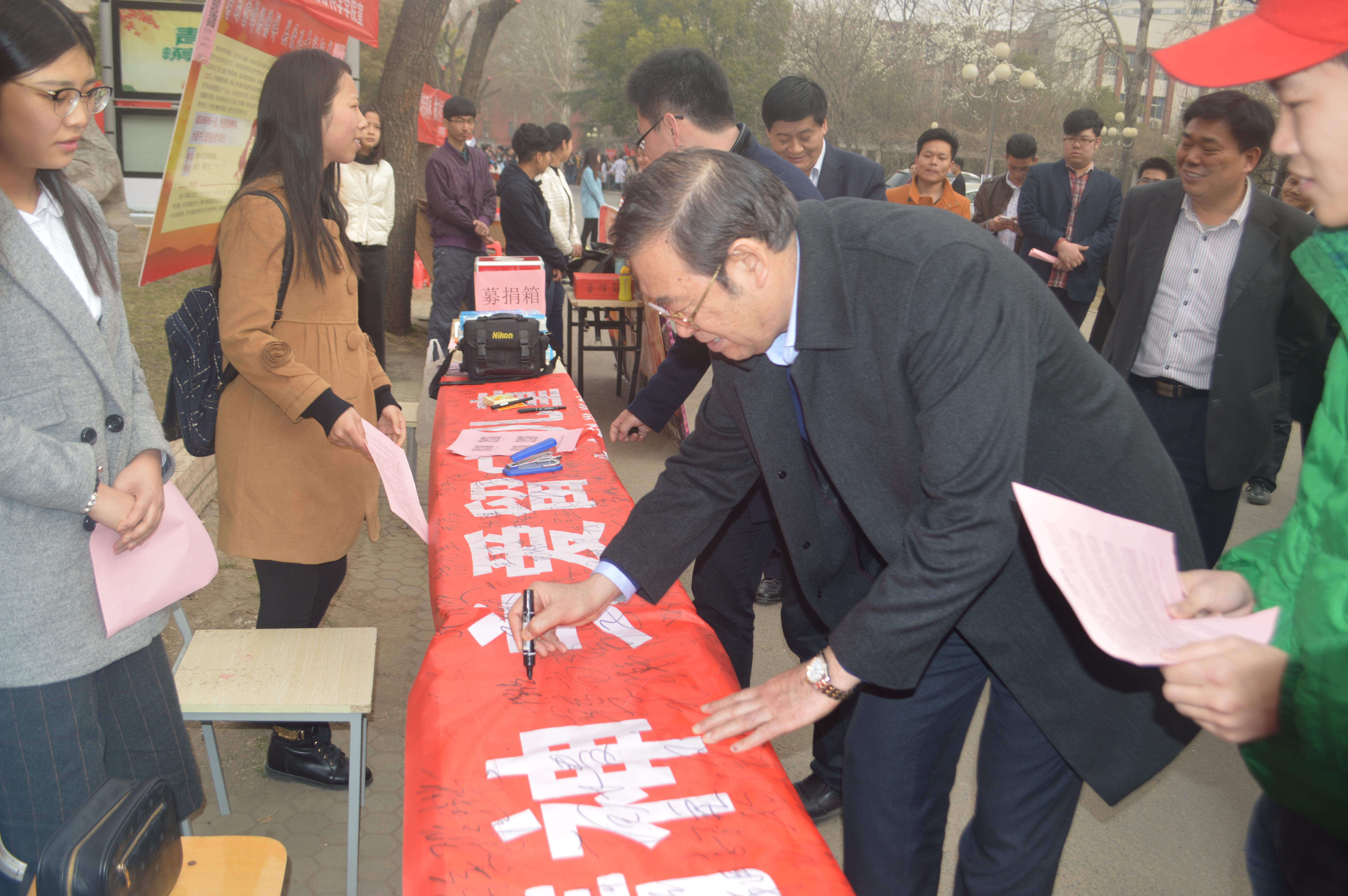 学生代表活动介绍后,纷纷在宣传条幅上签字,并为留守儿童捐出善款。校党委书记程传兴在接受采访中表示:在新时代下,雷锋精神永不过时,举办雷锋日活动是当代大学生弘扬雷锋精神,提高自我修养的重要体现。为留守儿童募捐,充分体现了无私奉献的雷锋精神,是学生们真正奉献爱心的体现。最后,程书记为色情片
