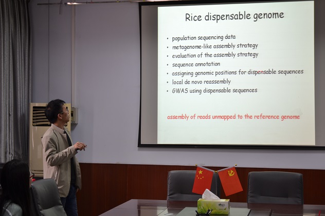 姚文博士在报告中介绍了他在博士研究生期间的工作:基于1483份水稻材料的低覆盖度基因组测序数据,使用类似微生物宏基因组研究中采用的组装策略,构建了水稻非必需基因组,并在此基础上进行了基因注释、序列定位和全基因组关联分析等后续工作。报告内容涉及基因组组装、注释,全基因组关联分析等基因组学技术及相关软件的使用。此次学术讲座开拓了学生的视野,极大地激发了学生的科研兴趣。
