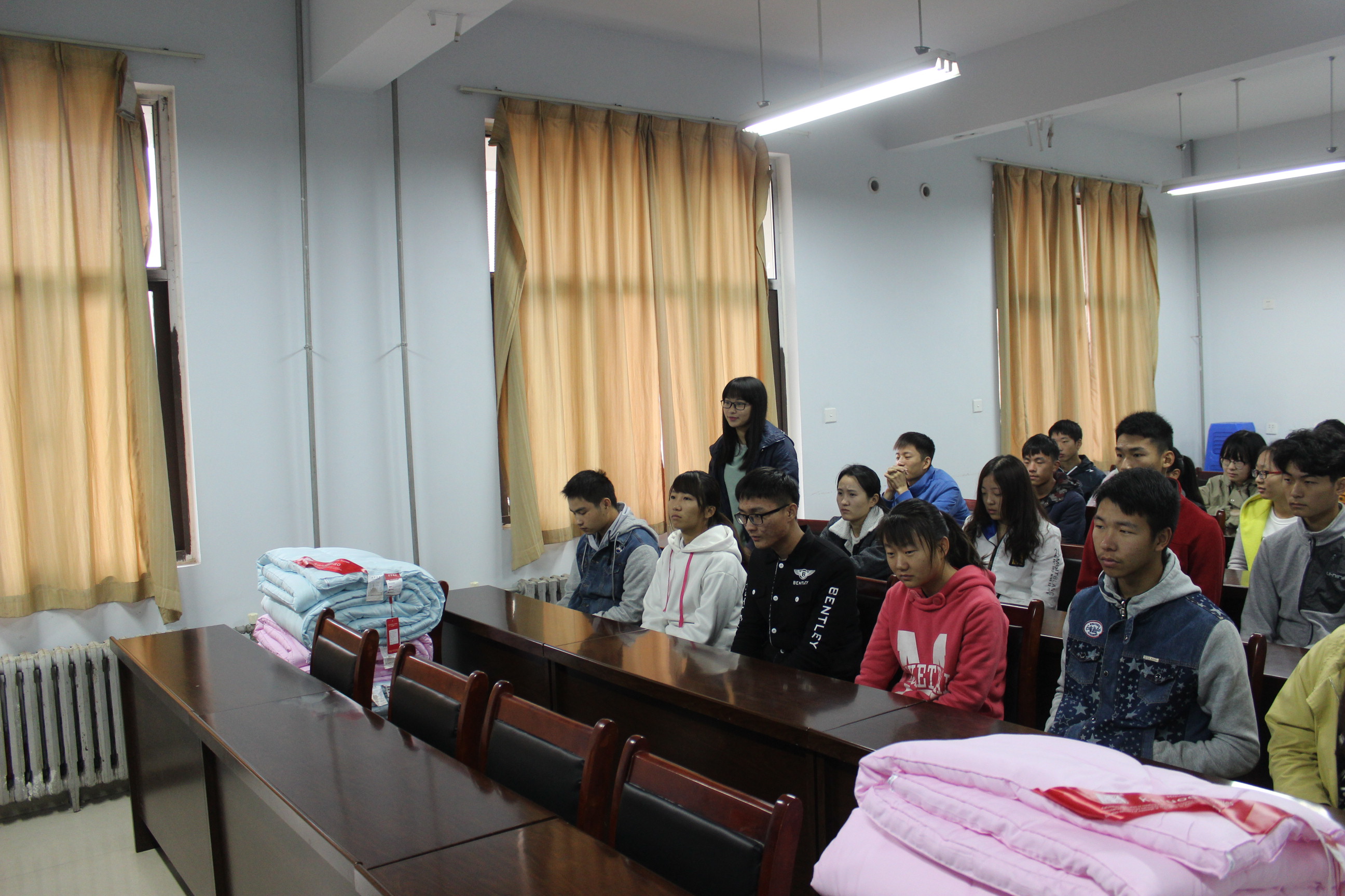 领导们真切慰问并送羽绒被给学生,关心同学们的学习、生活。同学们积极地分享自己在学校生活的感受,反馈自己在学校学习、生活中遇到的问题和疑惑并感谢学院的关心和爱护;院领导们认真听取同学们的诉求,耐心解答同学们的疑问,用自己的亲身经历、生活经验给同学们一些学习、生活的建议,并要求同学们努力学习,锻炼好身体,还强调同学们有困难和问题及时向学院反应,学院会尽最大努力帮同学们解决困难。
