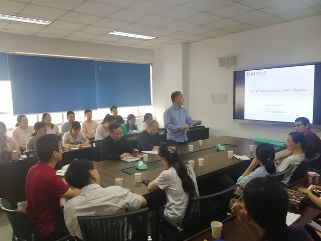 王海峰教授以《植物基因组学和表观遗传修饰》为题,介绍了基因组测序技术的研究现况和遇到的关键问题,分享了自己在甲基化领域取得的研究成果,展示了生物科学前沿的发展进程,就基因组测序后桂花的基因挖掘表达了自己的见解。在报告中,王教授强调科研要紧跟国际前沿研究领域,脚踏实地。