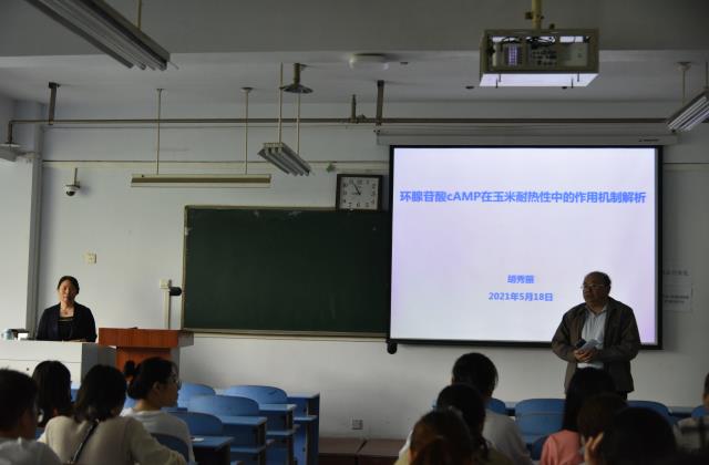 近年来,胡秀丽团队针对生产上培育耐高温玉米新品种的重大需求和瓶颈,在揭示玉米耐高温机制方面取得重要研究成果。胡老师以《cAMP调控玉米耐高温胁迫机制》为题,围绕玉米耐高温关键基因的挖掘、功能鉴定及利用等方面,详细讲解了如何发现并鉴定到一个新的腺苷酸环化酶ZmRPP13-LK3,以及如何提高玉米耐热性的作用机制。