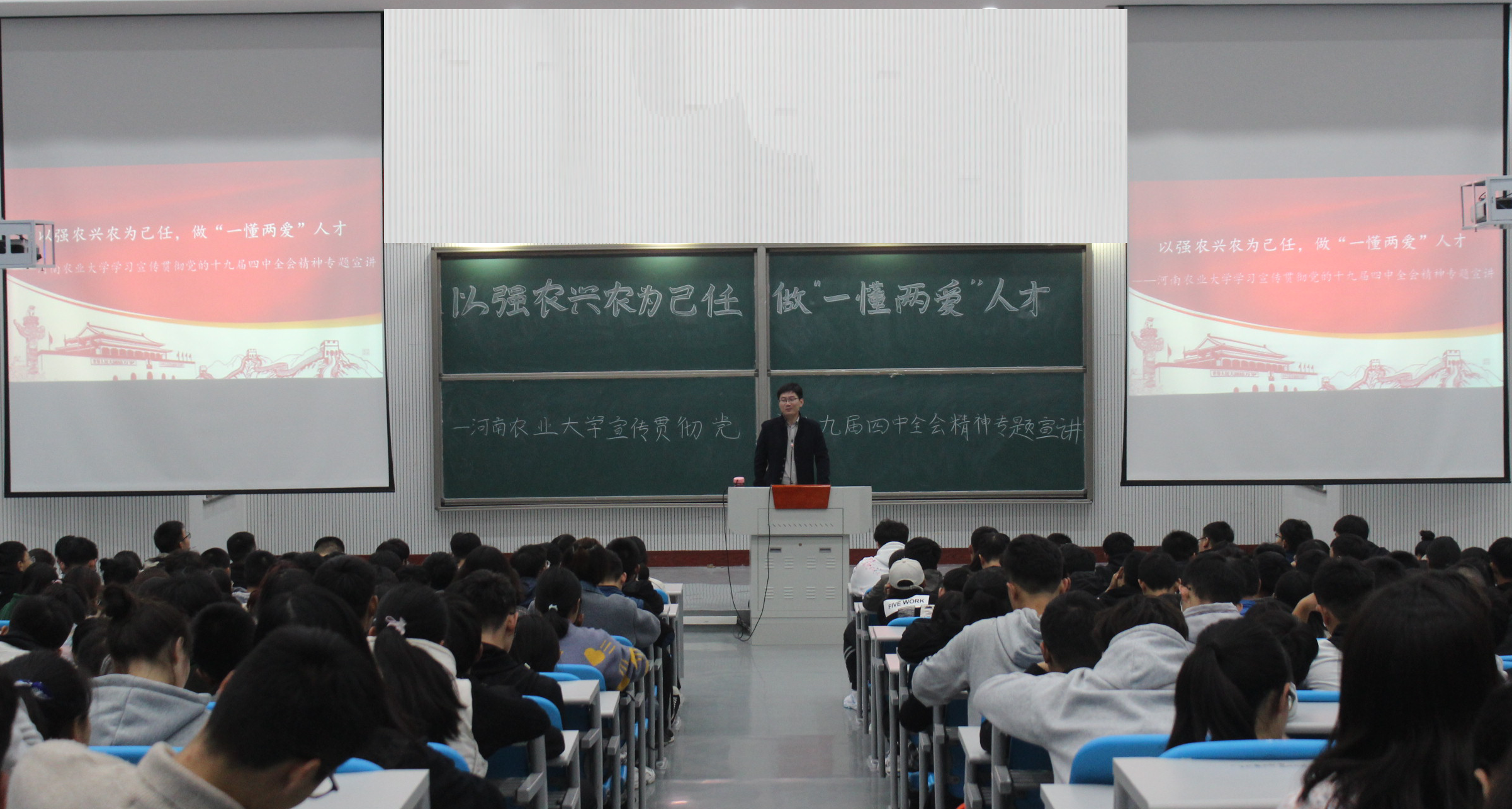 本次宣讲以“以强农兴农为己任,做‘一懂两爱’人才”为主题,从党的十九届四中全会精神解读、农大学子学思践行“三争做”两个部分展开。第一个部分,主讲老师以省委书记王国生在我校师生座谈会上的讲话切入,结合实例,对党的十九届四中全会精神进行系统解读,从改革开放全面深化、对一系列重大活动的评价、显著优势“十三个坚持”、一个总体目标及战略任务“十三个坚持和完善”五个方面对全会精神做了详细解读。第二部分,主讲老师从重温我校校史,讲述了河南及我校的榜样人物事迹,论述了河南是“天下粮仓”、粮食安全事关“人民饭碗”的地位,要求学生要坚守办学初心、提升专业素养,学习先进典型、收获自身成长,理论结合实践、坚定理想信念,抢抓发展机遇、打牢农大使命。
