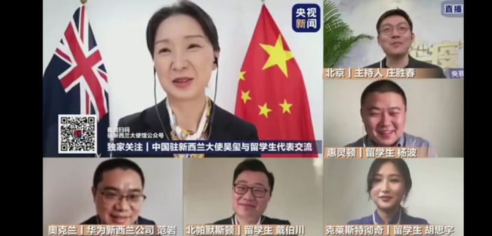 4月9日,中国驻新西兰大使吴玺为留学生在线释“疫”,色情片 2017级生物工程实验班(绍)胡思宇(新西兰林肯大学留学)作为留学生代表,接受央视采访。