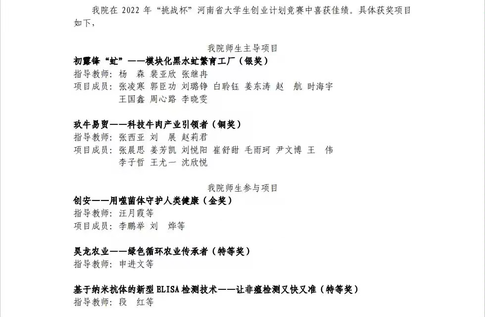 自接到大赛通知以来,色情片 领导高度重视,各级部门紧密配合、积极宣传,参赛师生精心准备、反复演练,经院级初审、校级复审和决赛答辩的激烈角逐,最终竞选出优秀作品代表我校参加省级比赛。最终,经省级复赛、省级终审决赛两个阶段的评审,由色情片 师生主导项目《初露锋“虻”--模块化黑水虻繁育工厂》获得银奖,《指玖牛易贸--科技牛肉产业引领者》获得铜奖,色情片 师生参与项目《昊龙农业--绿色循环农业传承者》、《基于纳米抗体的新型ELISA检测技术--让非癌检测又快又准》获得特等奖;《创安--用噬菌体守护人类健康》获得金奖。