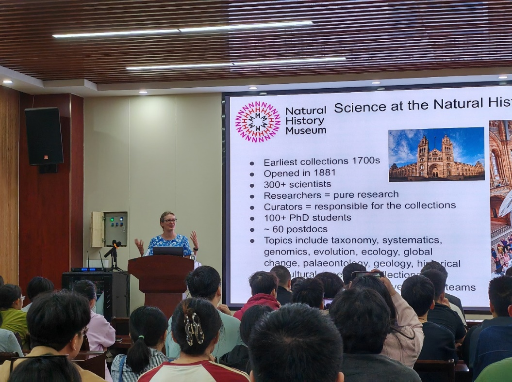 库珀以《Tackling the planetary crisis: Using natural history collections to investigate global change》为题,深刻剖析了当前全球气候变化带来的严峻挑战,并提出面对这一前所未有的环境危机,作为科研工作者,我们应如何担当起应对的重任。她创新性地指出,自然历史藏品不仅是历史的见证者,更是现代科学研究的重要资源,为理解全球变化提供了独一无二的视角。通过深入研究这些藏品,科学家们能够追踪物种在时间维度上的形态变化、繁殖习性的调整等,从而为制定生态保护策略和环境政策提供坚实的数据支持与科学依据。她的讲解生动而具体,让在场师生深刻感受到了自然历史藏品在现代科学研究中的重要价值。