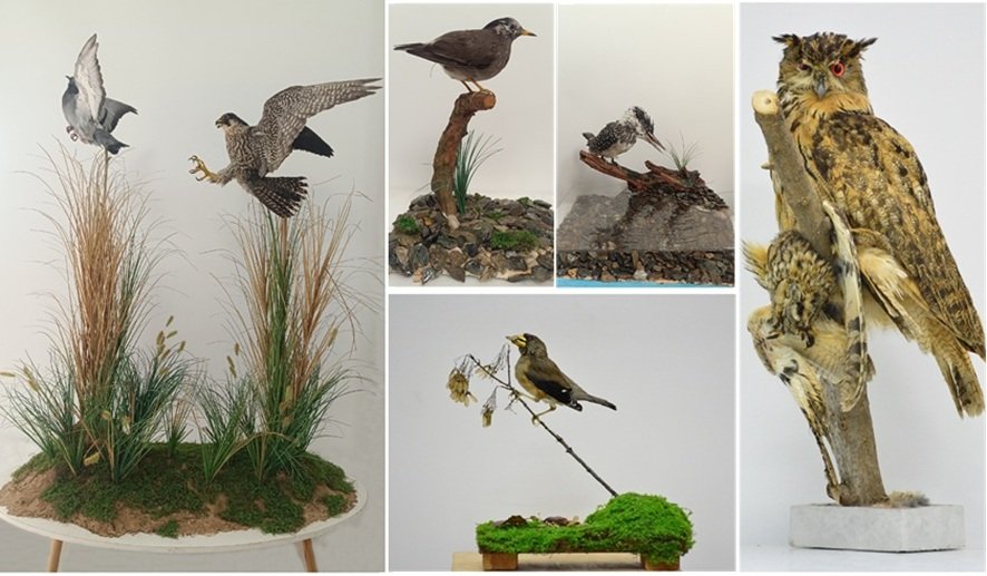 参赛标本为3组5件作品,作品构建了鸟类捕食、竞争到共生的立体化自然生存场景,体现了科学严谨性以及对大自然的敬畏,定格了生命的最美瞬间。获奖作品“生死追逐”以游隼(隼科中型猛禽)标本为核心,还原了信鸽低空飞行时遭遇游隼同高度追猎的惊险场景——训练有素的信鸽向上飞行规避,游隼因上升能力稍弱而错失猎物,定格了自然捕食中的智慧博弈。